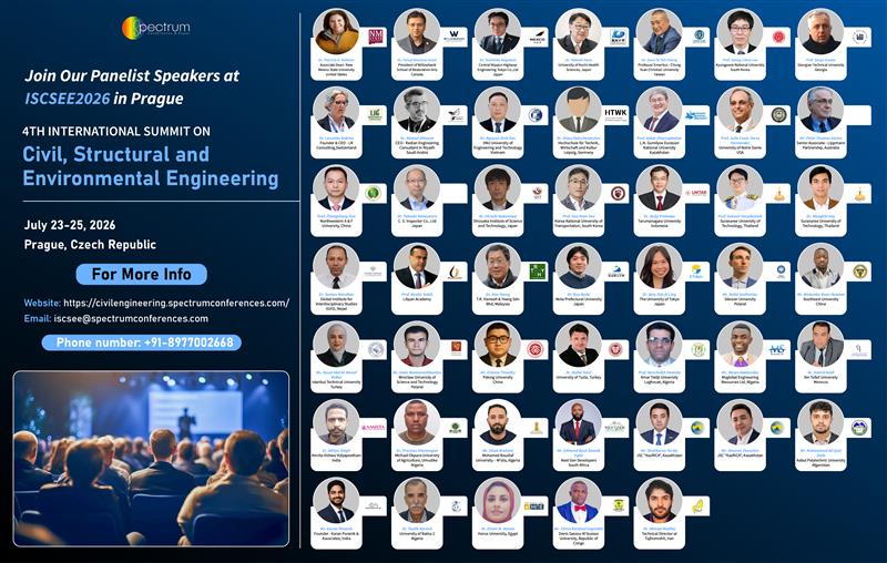 Spectrum Conferences cordially invites you to its 4th International Summit on Civil, Structural and Environmental Engineering (ISCSEE2026), which is going to be held in Prague, Czech Republic during July 23-25, 2026. Civil Engineering, Structural Engineering, Environmental Engineering, Geotechnical Engineering, Transportation Engineering, Construction Engineering, Water Resources...